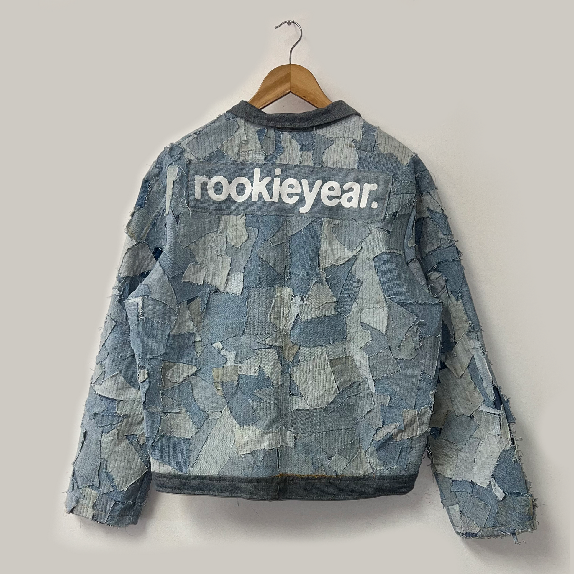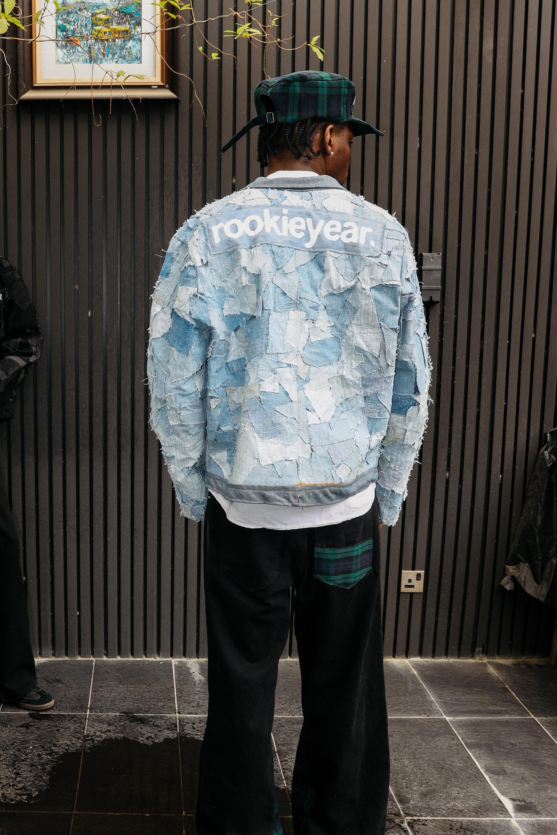 This is a Boro-style denim jacket made from 3 different washes of blue light-wash denim.